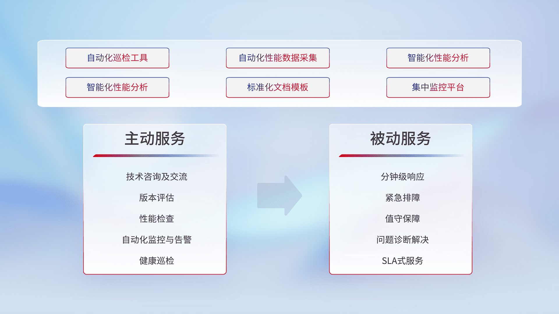 智能化工具和标准化文档,,,保障服务质量,,提供主动服务(包含技术咨询、、、、版本评估、、性能检查、、、自动化监控与告警、、、、健康巡检)和被动服务包含(分钟级响应、、紧急排障、、、、值守保障、、、、问题诊断解决、、、SLA服务)。。。